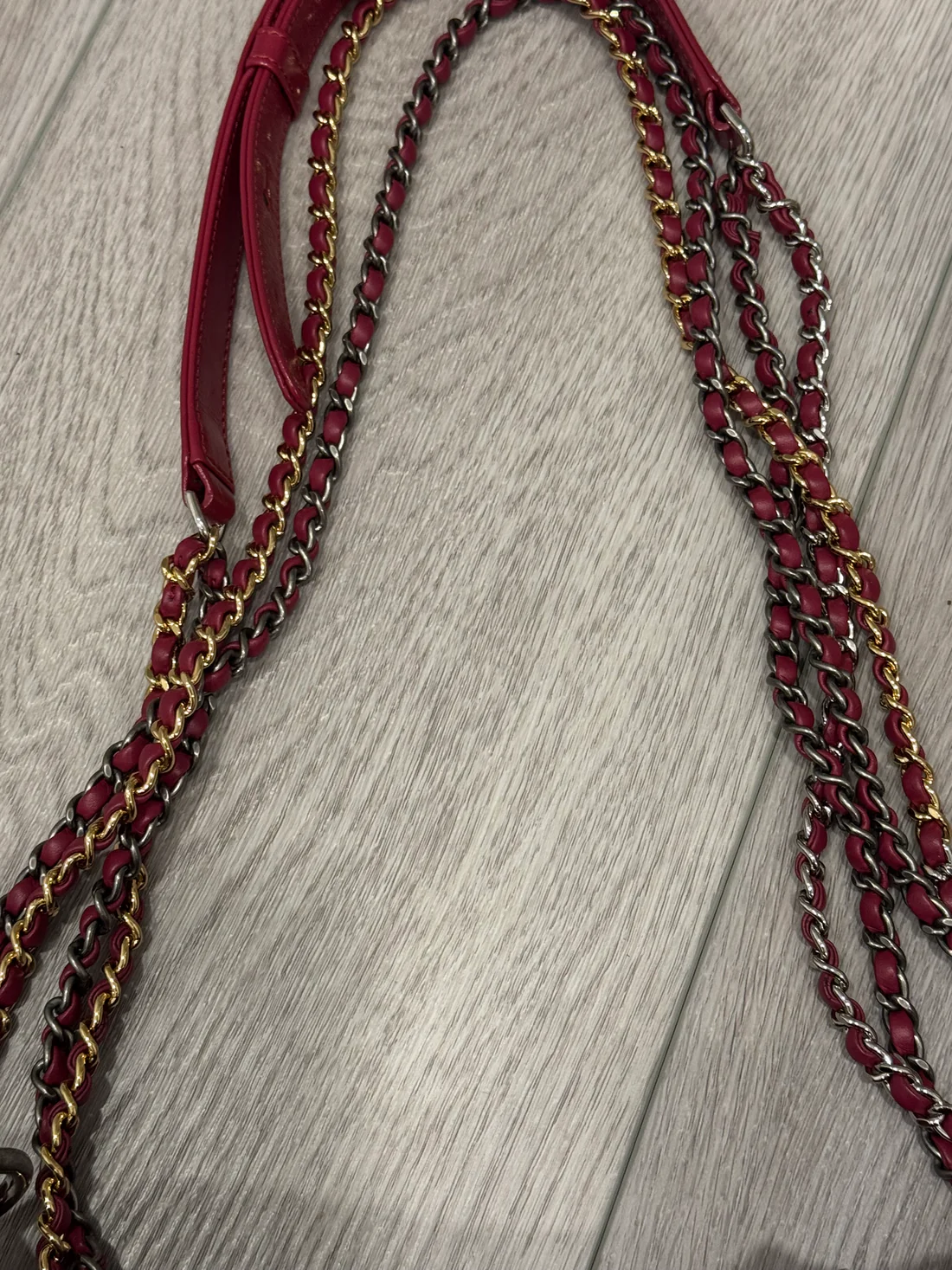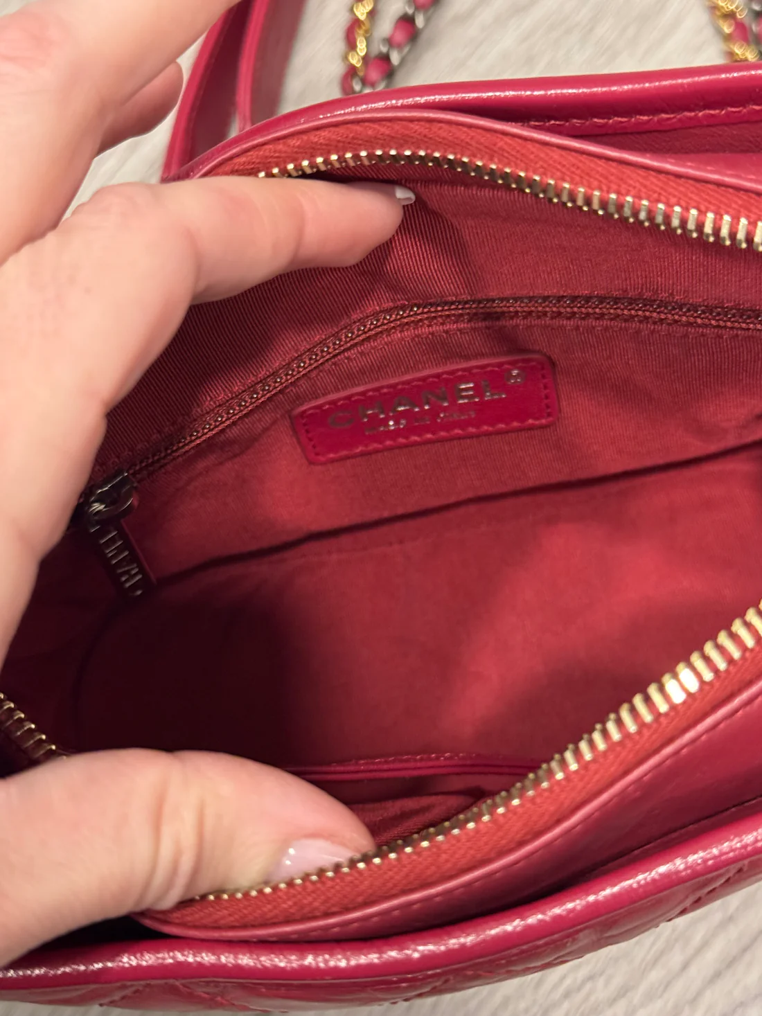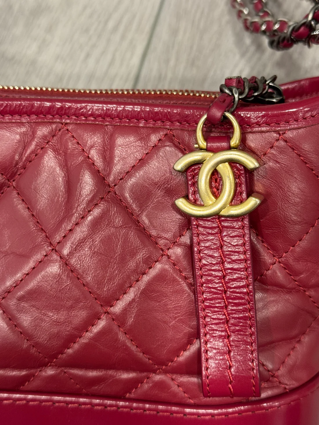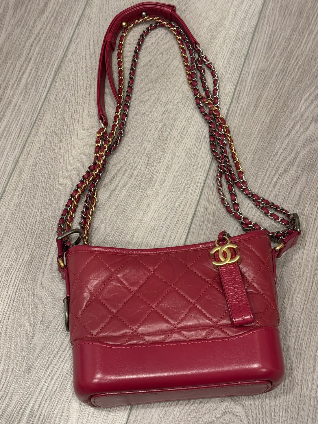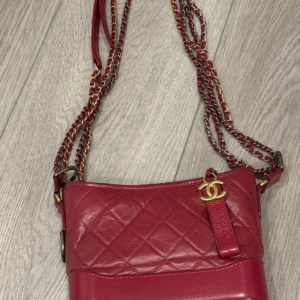 Cc small calfskin Gabrielle bag in gorgeous red color. Preloved with light signs of use but no notable marks. Comes with authenticity card. Can be worn crossbody or as a shoulder bag