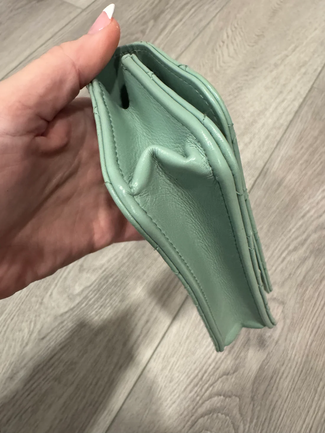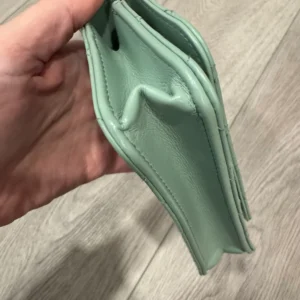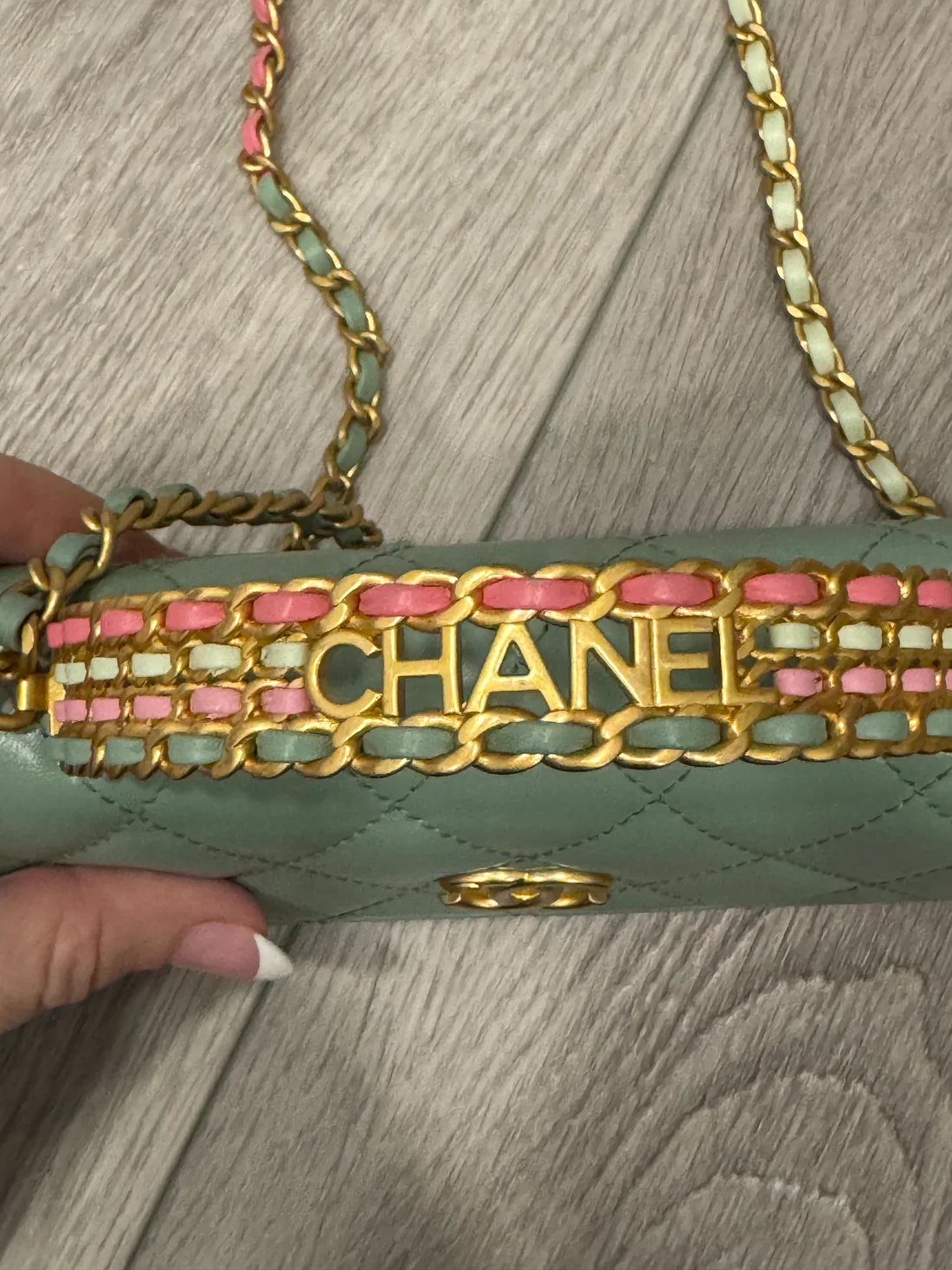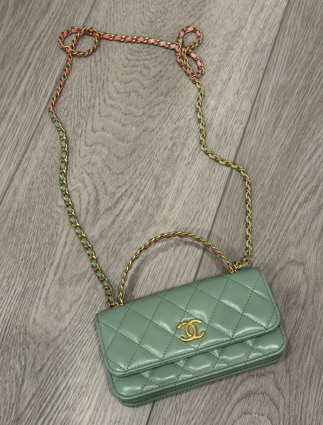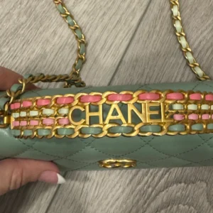 Cc top handle quilted calfskin phone holder. Has top handle and crossbody strap. Chain has shades of pink and green woven into it. Fits iPhone max.