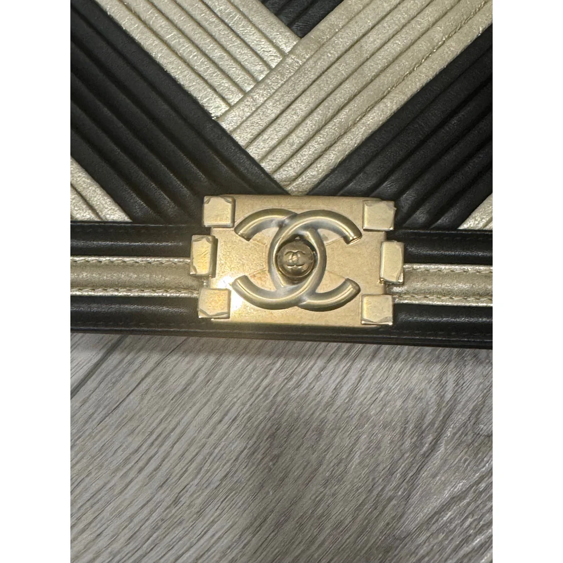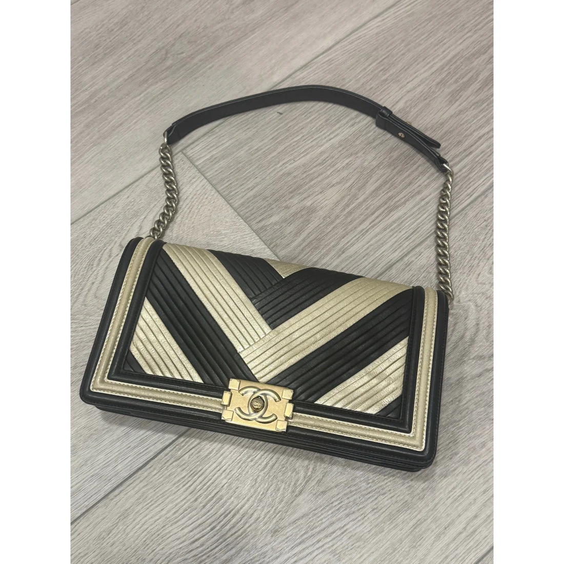 Chanel chevron gold and black shoulder boy bag