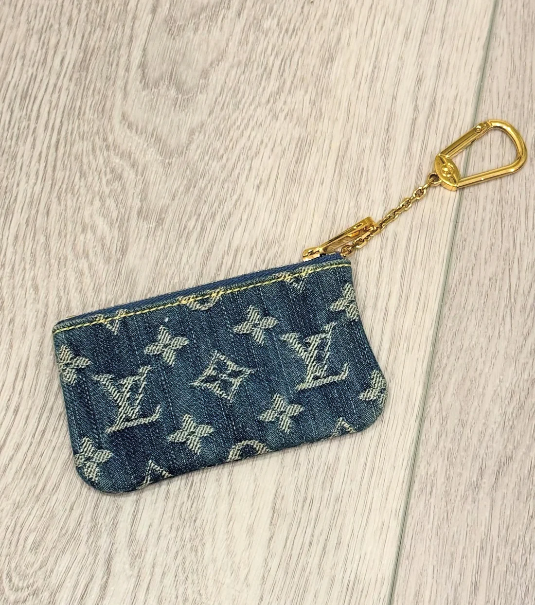 Lv denim key cles. Light scratches on hardware. Clean throughout. Comes with dustbag