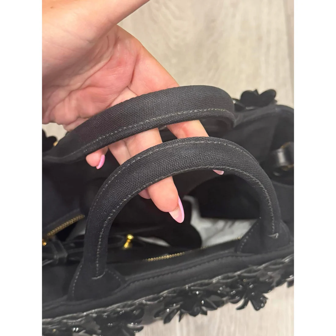 Black with acrylic flowers around opening. Top handle and detachable crossbody strap. Zipper closure. Comes with authenticity card